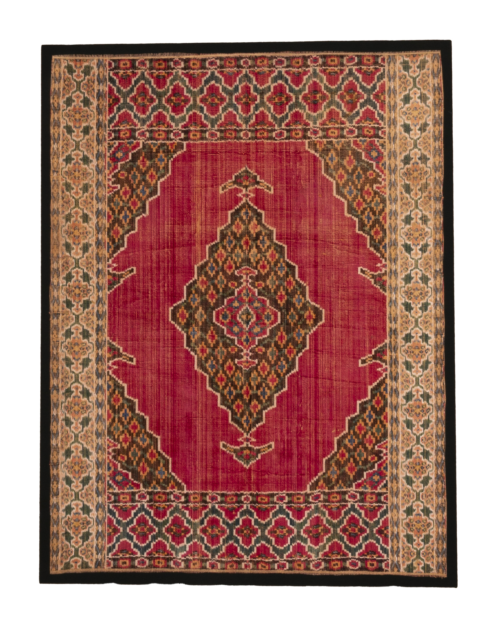 Yazd is an elegant city along the Dasht-e-Kavir desert, on the road from Isfahan to Kerman. It was well known for cotton and silk textiles (and velvets) and started later to produce carpets, a little bit in the style of Kerman, but mostly not as tightly knotted.
